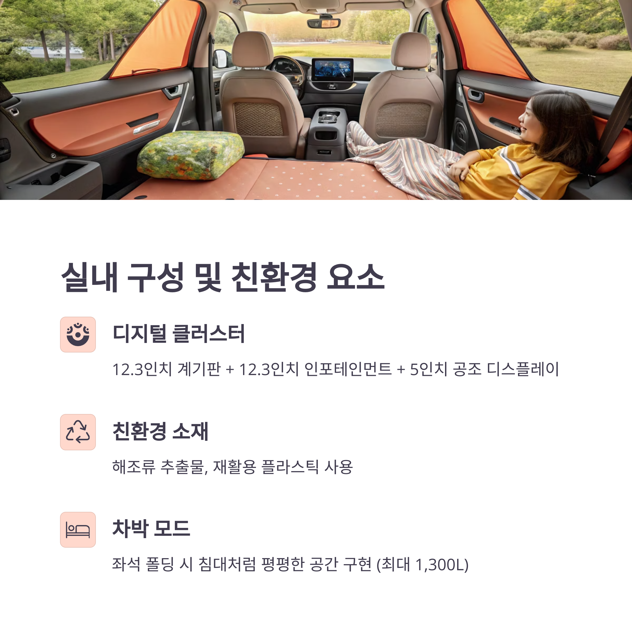 - 차박 모드: 좌석 폴딩 시 침대처럼 평평한 공간 구현