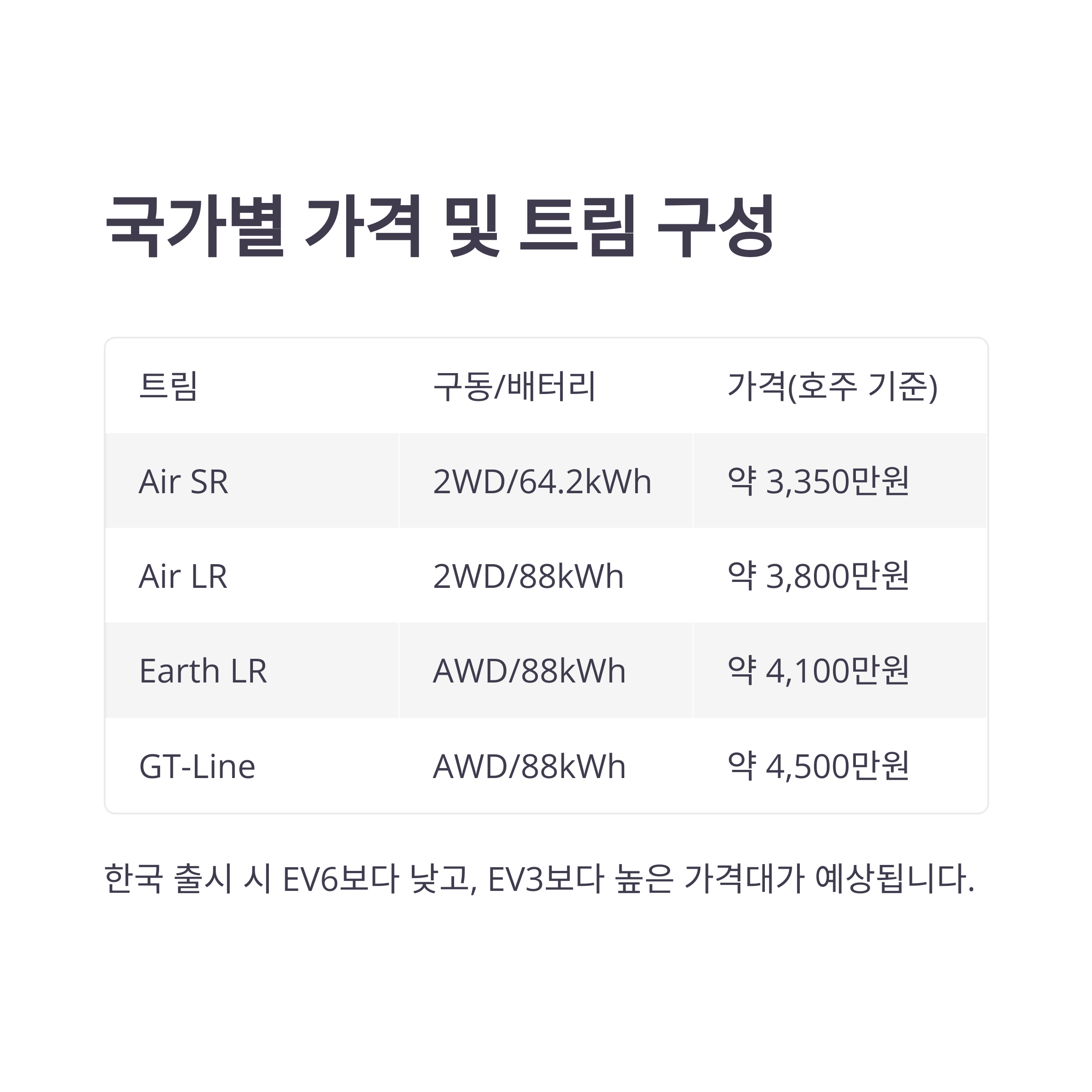 | Air LR | 2WD | 88kWh | 60,000달러대 | 약 3,800만원 |