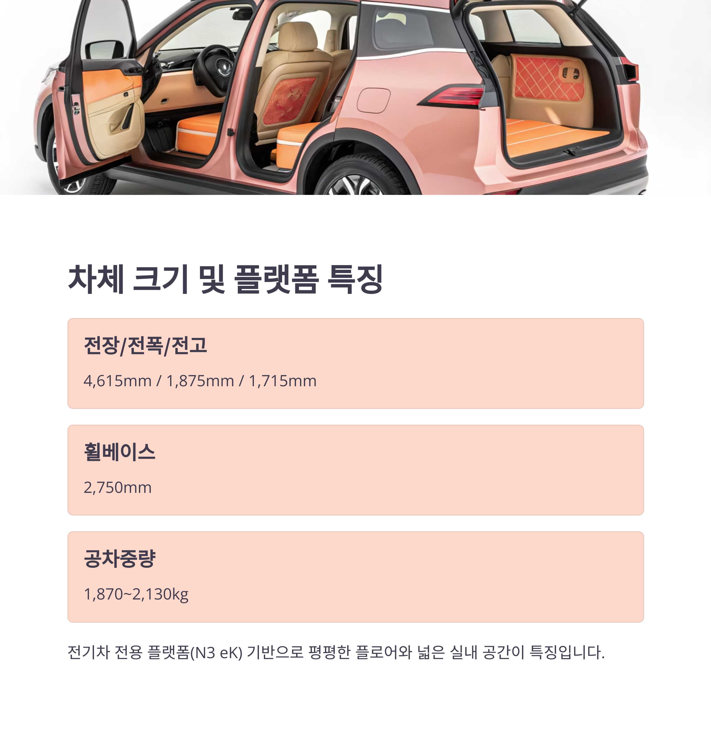 기존 내연기관 플랫폼 대비 실내 공간과 구조 효율성이 뛰어난 것이 특징입니다.