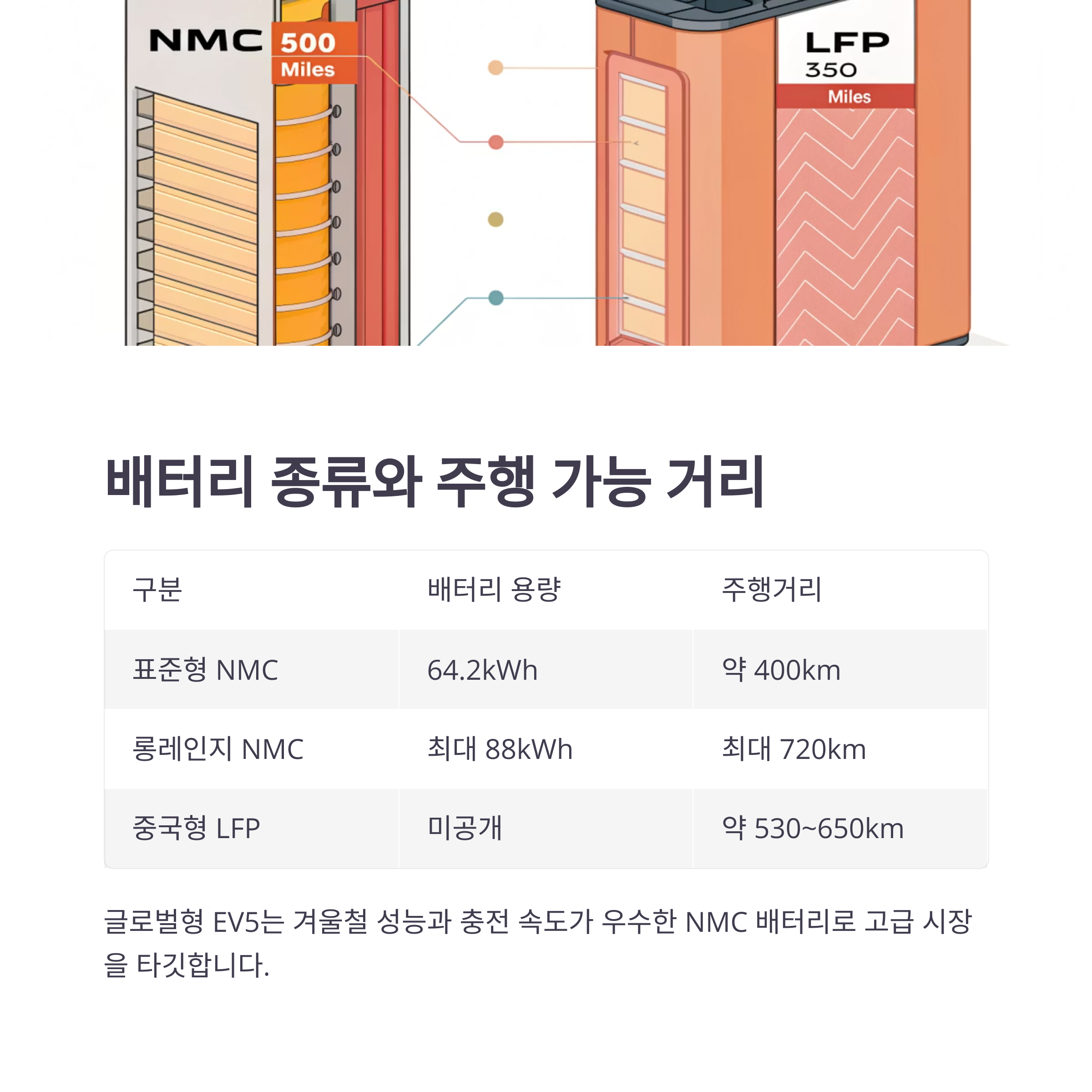 EV5는 시장별로 **두 가지 배터리 종류(LFP vs NMC)**를 채택하고 있습니다.
